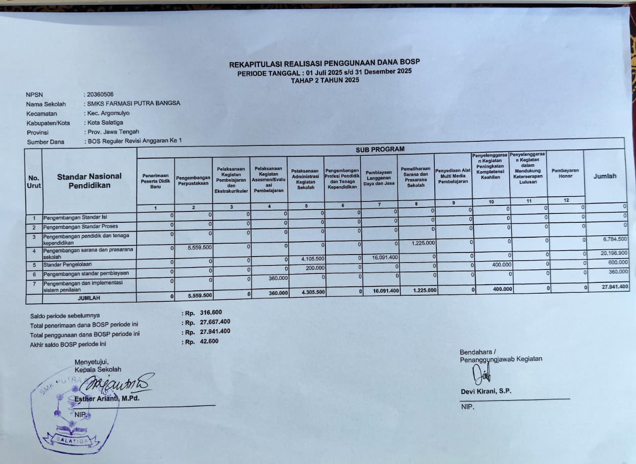 Laporan Realisasi Penggunaan Dana BOSP adalah dokumen yang berisi rincian penggunaan dana Bantuan Operasional Satuan Pendidikan (BOSP) oleh sekolah dalam periode tertentu. Laporan ini disusun untuk memastikan bahwa dana digunakan sesuai dengan ketentuan yang berlaku, serta mendukung transparansi dan akuntabilitas dalam pengelolaan keuangan sekolah, khususnya dalam mendanai kegiatan operasional dan pembelajaran.